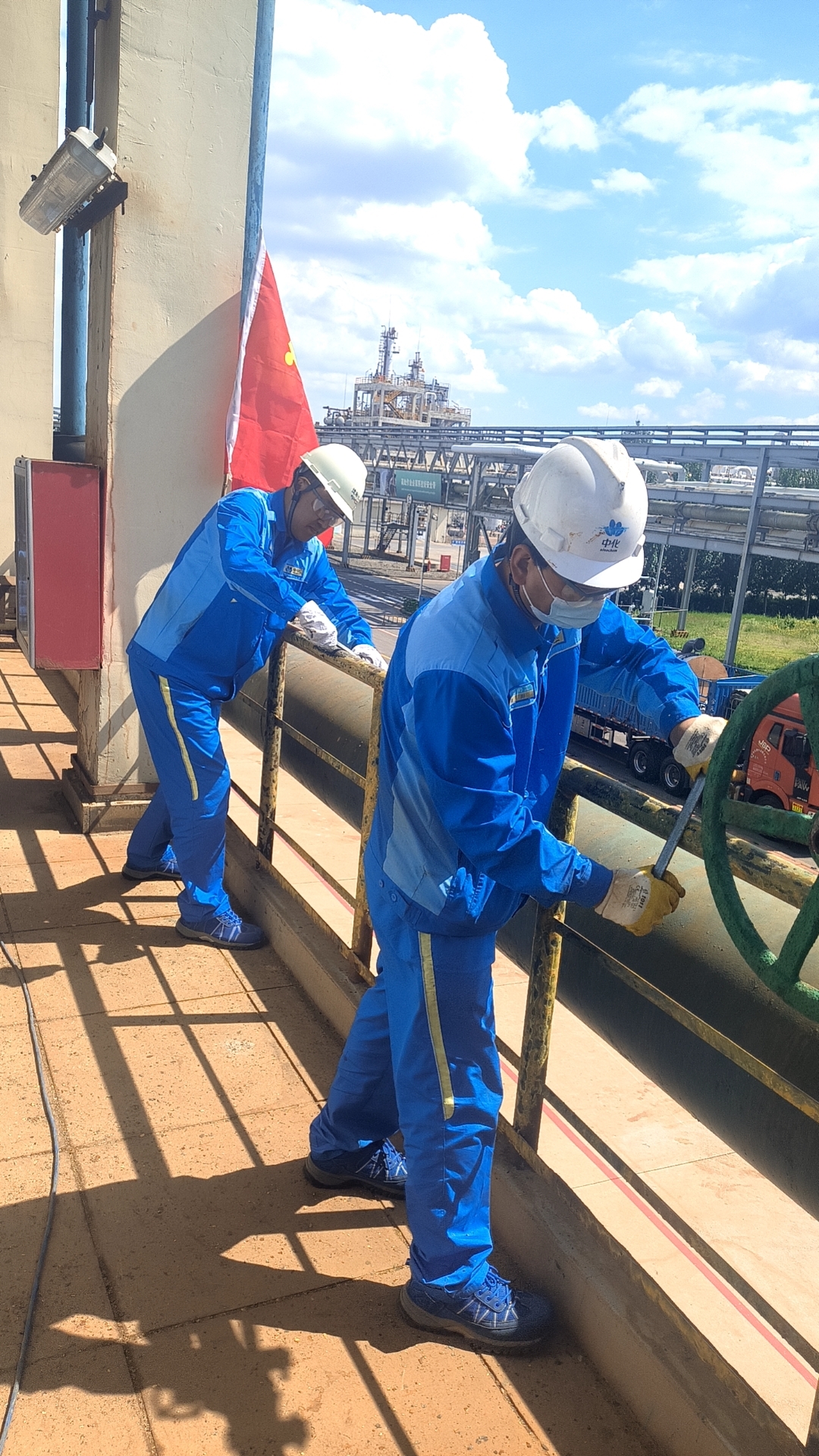 2024年5月31日,氯堿分廠黨總支組織在班黨員,在分廠鹽酸架臺(tái)開展了“除銹刷漆提升現(xiàn)場環(huán)境”黨員活動(dòng)。